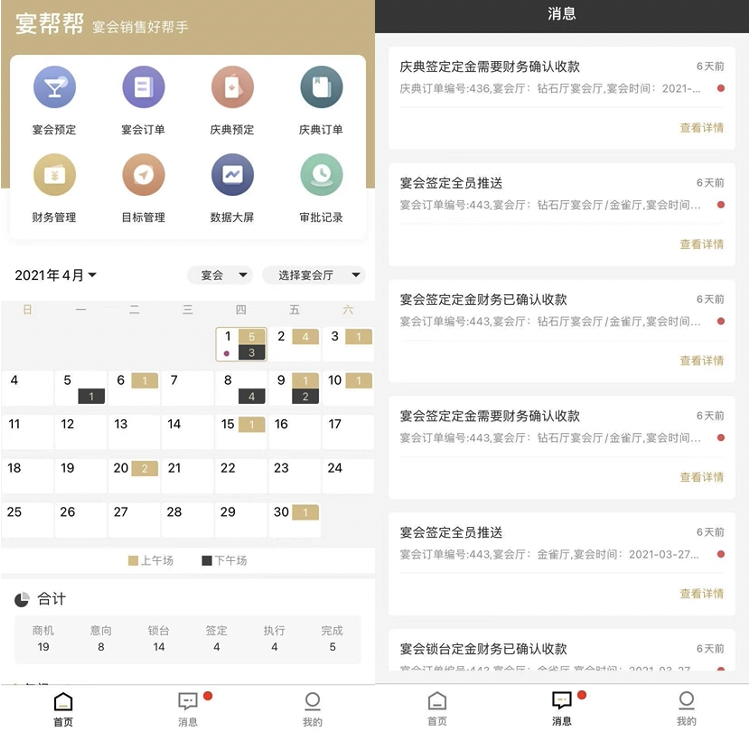 1,快速查询获取档期信息,预订情况一目了然 2,首页日历展示每日涂红,宴会信息一手掌握